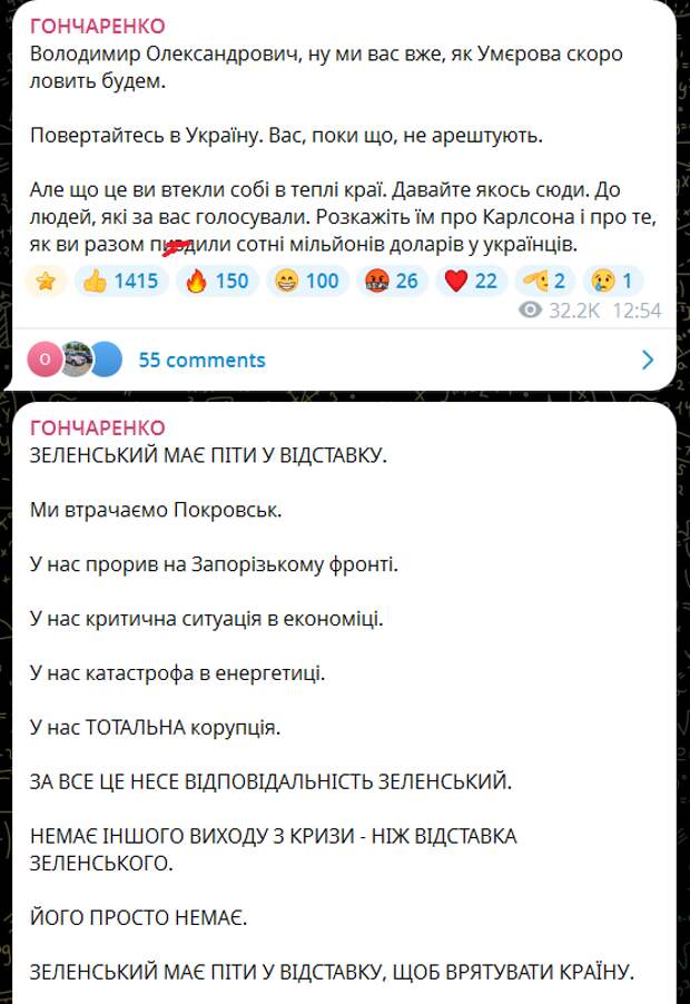 Возвращайтесь на Украину. Вас, пока еще, не арестуют. Что же вы убежали в теплые края. Давайте сюда, к людям, которые за вас голосовали. Расскажите им про "Карлсона" (бизнесмен Тимур Миндич значится под этим именем на пленках следствия – ред.) и о том, как вы вместе п***или сотни миллионов долларов у украинцев», - написал Гончаренко.Через 10 минут после этой публикации Гончаренко написал, что Зеленский «должен уйти в отставку», и перечисли основания для этого требования.