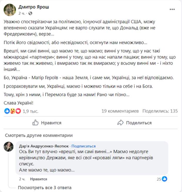 «Посему, хрен с ними, и Победа будет за нами! Рано или поздно...Слава Украине!», - подытожил Ярош.