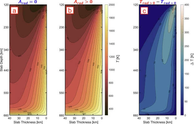 Это полностью меняет картину. Нагрев слэба происходит не только за счёт медленного «контакта» с горячей мантией, но и за счёт теплового излучения, которое, подобно свету, пронизывает толщу оливина. Это похоже на разницу между нагревом от горячей сковородки (теплопроводность) и нагревом от огня костра (излучение). Второй способ гораздо быстрее. Радиационный перенос даёт до 40% всего тепла, получаемого плитой.