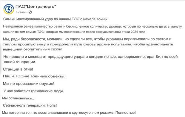 Станции в огне!.. Мы остановились ... сейчас-ноль генерации. Ноль! Мы потеряли то, что восстанавливали в круглосуточном режиме. Полностью!», - говорится в заявлении компании, размещенном в социальных сетях сегодня днём.