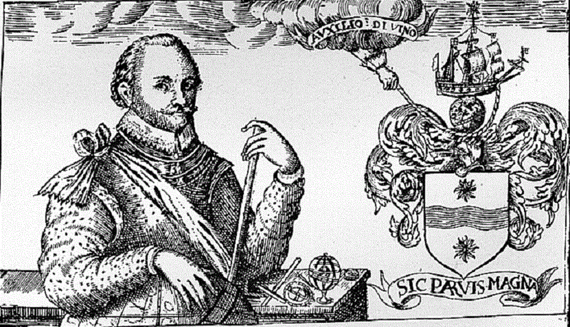 - Сэр Фрэнсис Дрейк с его геральдическим символом с девизом Sic Parvis Magna, что дословно переводится как «Так великое из малого (приходит)». Рука из облаков помечена Auxilio Divino — «С Божьей помощью»