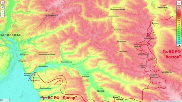 Южная часть полосы группировки «Восток», как считает блогер, остаётся за российскими силами в плане инициативы. После боёв за Рождественское, а также на фоне давления в районе Верхней Терсы, российские подразделения пытаются охватывать Воздвиженку. Одновременно продолжаются бои на подходах к Гуляйполю. Подоляка трактует всё происходящее как подготовительную фазу перед возможным более глубоким охватом украинской обороны на запорожском участке.