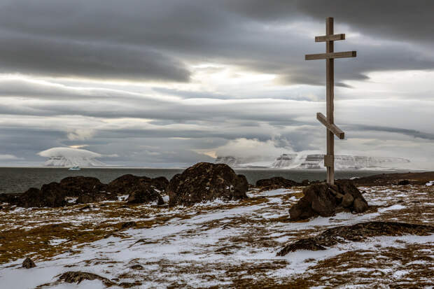 - Памятный поклонный крест в честь встречи участников экспедиций Георгия Брусилова и Георгия Седова в 1914 году. Мыс Флора острова Юрия Кучиева (ранее, до разделения острова проливом, — остров Нортбрук). Национальный парк «Русская Арктика»