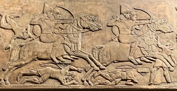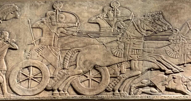 Сегодня мы продолжаем знакомство с экспонатами музея им. Пушкина в Москве, и путь наш лежит в зал истории Месопотамии, вход в который охраняется парой огромных крылатых быков-шеду с человеческими головами. А еще на стенах под самым потолком выставлены слепки с ниневийских барельефов, оригиналы которых хранятся в Британском музее в Лондоне. Глядя на них, и не скажешь, что это копии, а не подлинники. Но информации в них заключено вполне достаточно. Вот, например, здесь очень точно передан внешний вид именно ассирийской колесницы и нескольких ассирийских воинов…