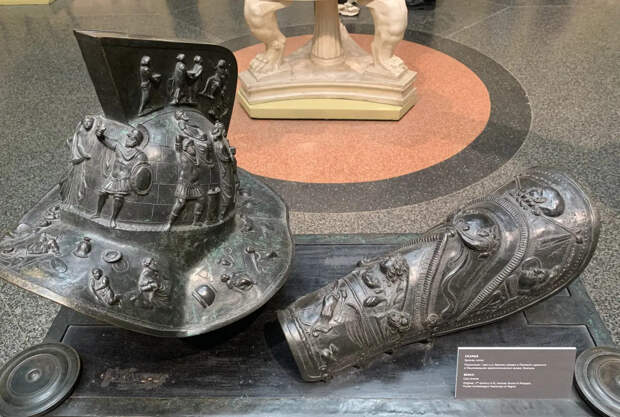Здесь же можно увидеть и вот такие прекрасные вещи: шлем и поножу гладиатора. Бронза, литье. Подлинники I века н.э.; найдены в Помпеях; аналоги хранятся в Национальном археологическом музее Неаполя