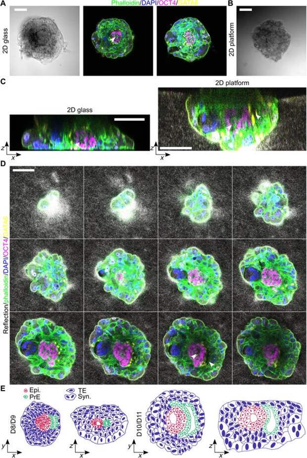 Адгезия эмбриона человека к стеклянной пластине и имплантация на 2D-платформе. (A) Иммуноокрашивание эмбриона человека, прикрепившегося к 2D-стеклянной пластине, с окрашиванием на phalloidin (зелёный), OCT4 (фиолетовый), DAPI (синий) и GATA6 (жёлтый). На эмбрионе виден OCT4-позитивный эпибласт с проамниотической полостью. Крупные многоядерные клетки появляются по краю эмбриона на стеклянной пластине. (B) Светлопольный снимок эмбриона человека, имплантированного на 2D-платформе. (C) Вид сбоку эмбриона человека, имплантированного на (слева) стеклянной поверхности и (справа) на 2D-платформе, с окрашиванием на phalloidin (зелёный), OCT4 (фиолетовый), DAPI (синий) и GATA6 (жёлтый). Эмбрион на 2D-платформе имеет большую высоту по сравнению с эмбрионом на стеклянной поверхности. (D) Серия конфокальных z-срезов. На эмбрионе виден OCT4-позитивный эпибласт с проамниотической полостью и предполагаемой полостью желточного мешка, окружённой GATA6-позитивными клетками. Различные клеточные слои цитотрофобласта и синцитиотрофобласта расположены между эпибластом и матриксом. (E) Схематическое изображение периимплантационного развития человека, основанное на наших результатах и стадиях Карнеги (Carnegie series). Распределение синцитиотрофобласта на 2D- и 3D-платформах отличается от такового при культивировании эмбриона на стекле. Эпибласт (Epi) показан красным, примитивная энтодерма (PrE) — зелёным, TE и синцитиотрофобласт (Syn) — синим. Все эмбрионы на стадии D11, все масштабные линейки — 100 мкм. Цитирование: Amélie Luise Godeau et al., Traction force and mechanosensitivity mediate species-specific implantation patterns in human and mouse embryos.Sci. Adv.11,eadr5199(2025).DOI:10.1126/sciadv.adr5199