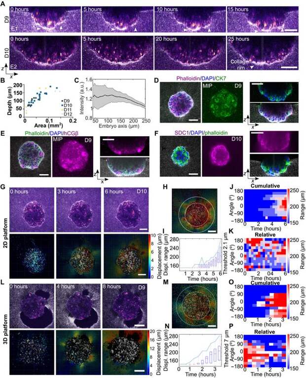 Паттерн смещения матрикса при инвазии эмбриона человека. (A) Ортогональные виды замедленной съёмки двух эмбрионов человека на стадиях (вверху) D9 и (внизу) D10 соответственно, имплантирующихся на 2D-платформе. Изображение волокон матрикса и их деформаций было получено с помощью светорассеяния, а эмбрион — с помощью автофлуоресценции и многофотонной подсветки. Эмбрионы интегрируются в матрикс (белые стрелки). (B) Глубина имплантации эмбрионов человека на 2D-платформе в зависимости от размера и времени. N > 3, n = 36. (C) График средней радиальной интенсивности сигнала коллагена вдоль оси эмбриона, причём сигнал максимален под эмбрионом. N = 8 эмбрионов, N > 3. (D, E) Виды сверху и сбоку иммуноокрашенного эмбриона человека, имплантированного на 2D-платформе, с окрашиванием на DAPI (синий), phalloidin (фиолетовый) и CK7 (зелёный). (E) Phalloidin (зелёный) и hCGβ (фиолетовый). MIP, проекция максимальной интенсивности. (F) Phalloidin (зелёный) и syndecan-1 (SDC1) (фиолетовый). Репрезентативный эмбрион из четырёх-шести. (G, L) Вверху: Замедленная съёмка (одна z-плоскость) эмбриона человека, имплантирующегося на 2D- или 3D-платформе. Изображение волокон матрикса и их деформаций было получено с помощью светорассеяния, а эмбрион — с помощью автофлуоресценции и многофотонной подсветки. Внизу: Соответствующие карты кумулятивного смещения коллагена во всём 3D-объёме, сгенерированные одиночными эмбрионами. Амплитуда смещения обозначена цветом, а направление смещения указано стрелками. Масштабные линейки, 100 мкм. (H, M) Контур радиуса для рассчитанного диапазона смещения. (I, N) График, показывающий расстояние от эмбриона, на котором наблюдается смещение в 2.1 или 7.1 мкм. Диапазон смещения коллагена увеличивается со временем вокруг эмбриона. (J, O) Тепловая карта радиального распределения кумулятивного и (K, P) относительного смещения для репрезентативного эмбриона на 2D- или 3D-платформе. Смещение является однородным вокруг эмбриона. Повторяющееся смещение коллагена происходит вокруг эмбриона. Репрезентативные эмбрионы для n2D = n3D = 4 эмбрионов. Масштабные линейки, 100 мкм. Цитирование: Amélie Luise Godeau et al., Traction force and mechanosensitivity mediate species-specific implantation patterns in human and mouse embryos.Sci. Adv.11,eadr5199(2025).DOI:10.1126/sciadv.adr5199