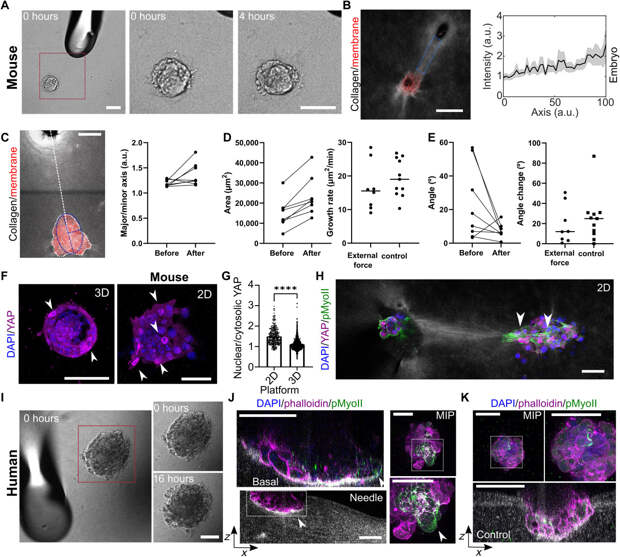 Эмбрионы воспринимают и отвечают на внешний силовой сигнал. (A) Замедленная съёмка микроиглы, оказывающей давление рядом с эмбрионом мыши на 2D-платформе. (B) Слева: Рассеяние света при уплотнении коллагена между эмбрионом (tdTomato, красный) и иглой. Справа: Нормализованная интенсивность коллагена вдоль оси микроиглы (слева) и оси эмбриона (справа) (нормализованная длина); интенсивность коллагена увеличивается. n = 6 эмбрионов. (C-F) Размер площади, морфология и ориентация эмбриона относительно соединительной оси до и после оказания давления в сравнении с контролями. Парный t-критерий, n.s. (C) Слева: Схематическое изображение аппроксимации эллипсом (синий) разрастания (outgrowth) эмбриона (белый) и соединительной оси. Справа: Удлинение разрастания (outgrowth) увеличивается, при этом соотношение большой/малой оси изменяется с 1.20 +- 0.02 до 1.34 +- 0.09. (D) Размер разрастания (outgrowth) увеличивается с 16,472 +- 2531 мкм² до 24,958 +- 3521 мкм², скорость роста аналогична контрольным эмбрионам. NWT = 4, nWT = 11. (E) Выравнивание эмбриона по игле усиливается, при этом средний угол уменьшается с 22.8° +- 9.0° до 7.1° +- 1.7°. Контрольные эмбрионы показывают большее изменение угла. NWT = 4, nWT = 11; N = 7, n = 8. Ошибка: SEM. (F) Иммуноокрашивание на DAPI и YAP в эмбрионах мыши стадии E7.5 на 2D- и 3D-платформах. YAP является ядерным в некоторых (3D) муральных клетках трофобласта и (2D) гигантских клетках трофобласта (TGCs). (G) График распределения YAP в ядре относительно цитоплазмы, с более высоким соотношением в гигантских клетках трофобласта (TGCs). N = 2, n2D = n3D = 9. (H) Иммуноокрашивание на DAPI, phalloidin и YAP в эмбрионах (2D-платформа). YAP экспрессируется в правом эмбрионе вдоль механического мостика. (I) Замедленная съёмка микроиглы, оказывающей давление рядом с эмбрионом человека на 2D-платформе. (J, K) Вид сбоку и MIP (проекция максимальной интенсивности) эмбрионов человека стадии D10, подвергшихся воздействию внешней силы или контрольных, окрашенных на DAPI, фосфорилированный миозин 2 (pMyoII) и phalloidin. pMyoII обогащён на базальной стороне (стрелки). Репрезентативно для N = n = 3. Масштабные линейки, 100 мкм. Цитирование: Amélie Luise Godeau et al., Traction force and mechanosensitivity mediate species-specific implantation patterns in human and mouse embryos.Sci. Adv.11,eadr5199(2025).DOI:10.1126/sciadv.adr5199