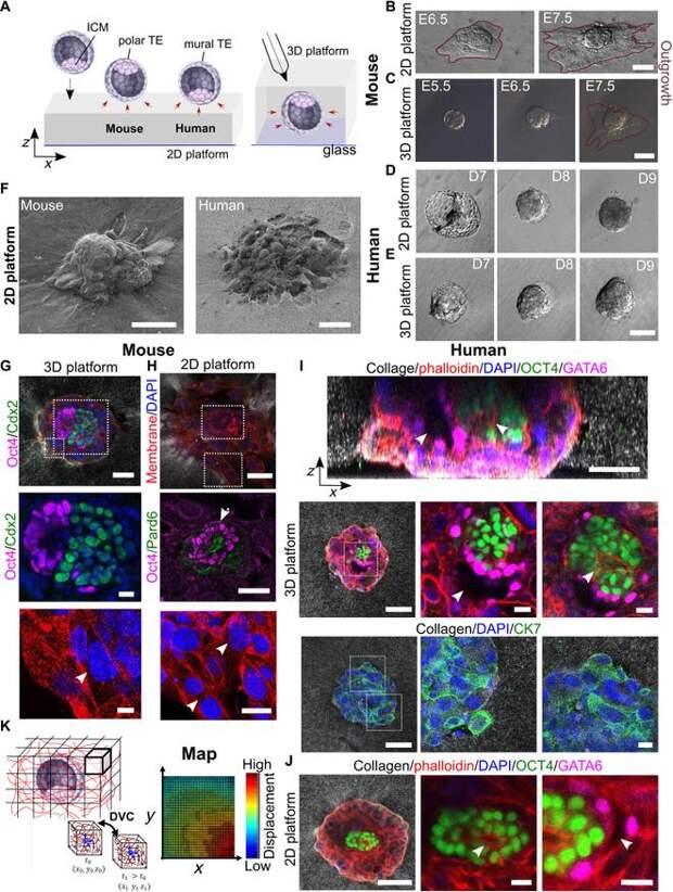 Точнее, сложный флуоресцентный микроскоп, способный фиксировать не только изображение, но и механические силы. Платформа ex vivo для изучения имплантации эмбрионов человека и мыши. (A) Схематическое изображение имплантации бластоцист мыши и человека на 2D- и 3D-платформах. Эмбрионы мыши прикрепляются муральной стороной, а бластоцисты человека — полярной TE. (B-E) Снимки имплантации эмбриона мыши или человека на 2D- и 3D-платформах. Разрастание (outgrowth) увеличивалось со временем (красный контур). Масштабные линейки, 100 мкм. (F) Изображения, полученные с помощью сканирующей электронной микроскопии: (слева) эмбриона мыши и (справа) эмбриона человека, имплантированных на 2D-платформе. Масштабные линейки, 50 мкм. (G) Иммуноокрашивание на 4′, 6-диамидино-2-фенилиндол (DAPI), Oct4 и Cdx2 эмбриона мыши, экспрессирующего мембраносвязанный tdTomato, имплантированного на 3D-платформе на стадии E7.5. На вставках показаны эпибласт, ExE и многоядерные клетки трофобласта (белая стрелка). Масштабная линейка, 50 мкм. Вставка: масштабная линейка, 10 мкм. (H) Иммуноокрашивание на DAPI, Oct4 и Pard6 эмбриона мыши, экспрессирующего мембраносвязанный tdTomato, имплантированного на 2D-платформе. На вставках показаны проамниотическая полость и многоядерные клетки (белые стрелки). Масштабные линейки, 100 и 50 мкм (на вставке). (I, J) Иммуноокрашивание на DAPI, phalloidin, OCT4, GATA6 и CK7 эмбрионов человека (репрезентативные для пяти эмбрионов) на стадии D10, имплантированных на (I) 3D-платформе (вверху — ортогональный вид, внизу — вид сверху) и (J) 2D-платформе. Белые стрелки указывают на предполагаемый желточный мешок и проамниотическую полость. Масштабные линейки, 100 мкм, 50 мкм (ортогональный вид) и 20 мкм (на вставках). (K) Схематическое описание анализа цифровой объёмной корреляции (DVC). Реперные маркеры отслеживались между временными точками, и была создана карта смещений. Амплитуда смещения обозначена цветом, а стрелки указывают направление смещения. Цитирование: Amélie Luise Godeau et al., Traction force and mechanosensitivity mediate species-specific implantation patterns in human and mouse embryos.Sci. Adv.11,eadr5199(2025).DOI:10.1126/sciadv.adr5199