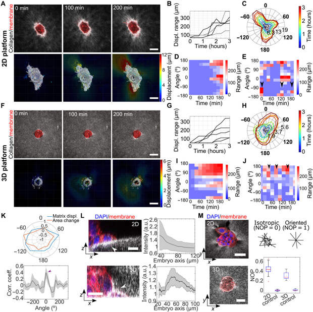 Анизотропные паттерны смещения, возникающие во время инвазии эмбриона мыши. (A, F) Вверху: Замедленная съёмка эмбрионов (мембраносвязанный tdTomato, красный), деформирующих коллагеновый матрикс (рассеяние света) во время имплантации на 2D- и 3D-платформах (одна z-плоскость). Внизу: 3D-карты кумулятивного смещения коллагена с цветовой кодировкой по амплитуде и направлением смещения, указанным стрелками. Масштабные линейки, 100 мкм. (B, G) Графики расстояния от эмбриона, на котором наблюдается пороговое смещение во времени. Диапазон смещения увеличивался со временем. Порог: 1.2 мкм (сплошная линия) и 3.4 мкм (пунктирная линия), N = 2 и n = 5 [2D-платформа в (B)]. Порог: 1.9 мкм, N = 2 и n = 5 [3D-платформа в (G)]. (C, H) Полярный график контурных линий изосмещения (кумулятивного), сгенерированных одиночными эмбрионами на 2D- и 3D-платформе соответственно. Время обозначено цветом. (D, I) Тепловая карта радиального кумулятивного относительного смещения для репрезентативного эмбриона. Смещение коллагена увеличивалось вдоль двух основных осей, причём оси смещения менялись со временем. Чёрные стрелки показывают повторяющееся смещение. (K) Вверху: График смещения коллагена (синий) и разрастания (outgrowth, оранжевый) для репрезентативного эмбриона. Внизу: Средняя корреляция с пиком в точке 0 (фиолетовая стрелка). Ошибка: SEM. N = 2, n = 5 эмбрионов. (L) Ортогональные снимки эмбрионов (tdTomato, красный), имплантирующихся на 2D (вверху слева) и 3D (внизу слева) платформах (DAPI, синий). Белая стрелка — усиленный сигнал коллагена. Масштабные линейки, 20 мкм. Справа: Радиальная интенсивность коллагена, достигающая пика под эмбрионами. N2D = 11 эмбрионов, n3D = 8, N > 3. (M) Снимки эмбрионов (tdTomato, красный), имплантирующихся на 2D- и 3D-платформах (DAPI, синий). Масштабные линейки, 20 мкм (2D) и 50 мкм (3D). Схематическое изображение параметра нематического порядка (NOP; 0 = случайное, 1 = выровненное). Распределение NOP показывает радиальную организацию коллагена на обеих платформах. n = 14, N > 3, n = 6; контроль: N = 2 z-стека. a.u., условные единицы. Цитирование: Amélie Luise Godeau et al., Traction force and mechanosensitivity mediate species-specific implantation patterns in human and mouse embryos.Sci. Adv.11,eadr5199(2025).DOI:10.1126/sciadv.adr5199
