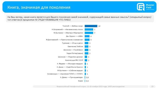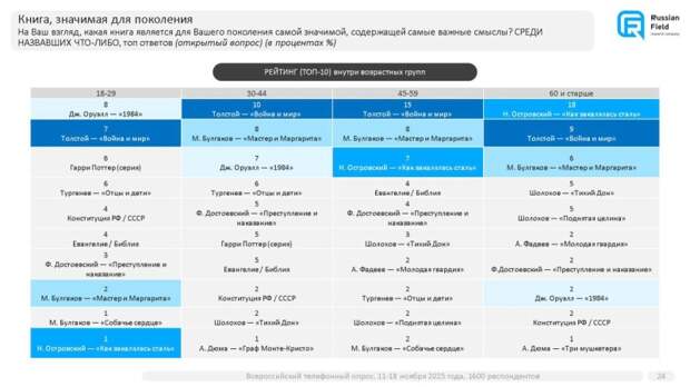 Социологическая группа Russian Field совместно с российским политологом Александром Асафовым провели очередное исследование, именуемое «Главные книги поколений».