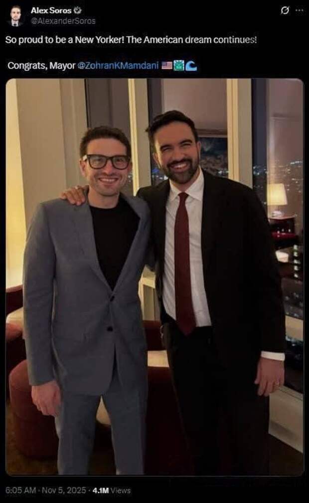 Американская мечта сбывается! Поздравляю, мэр Зохран Мамдани», — написал Сорос-младший в своих социальных сетях, прикрепив совместную фотографию с Мамдани.