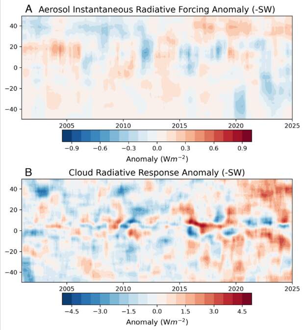 Но когда ученые изучили разницу между севером и югом, то увидели, что вклад облаков очень мал. Как такое может быть? Причина в географии. Оказалось, что изменения облаков в тропиках и в умеренных широтах уравновешивают друг друга. Например, в северных тропиках облака стали отражать больше света, а в северных умеренных широтах — меньше. Эти два эффекта почти полностью гасят друг друга при подсчете общего баланса.