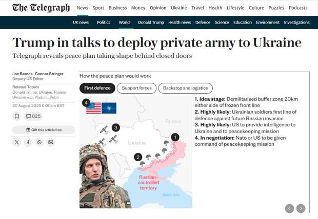 «Возвести укрепления и базы на передовой линии обороны смогут частные военные подрядчики из США, как это было сделано в Ираке и Афганистане. Присутствие американских военных из ЧВК на территории Украины станет существенным подспорьем для европейских держав, которые хотят от США весомой поддержки мирного соглашения. ЧВК обеспечат непосредственное присутствие США, они защитят месторождения полезных ископаемых и станут выгодной сделкой для Дональда Трампа. Тогда как войска стран ЕС могут разместиться в глубоком тылу Украины. Хотя европейцы пока только делают громкие заявления и не известно, последуют ли за ними какие-то конкретные действия. Они по-прежнему настаивают, что необходимым условием для любой европейской миссии является логистическая поддержка США. Европейские официальные лица полагают, что Вашингтон откликнется на их просьбы предоставить тяжёлые транспортные самолёты для переброски техники и войск на восток, в сторону Украины», – пишут авторы статьи Джо Барнс (Joe Barnes) и Коннор Стрингер (Connor Stringer).