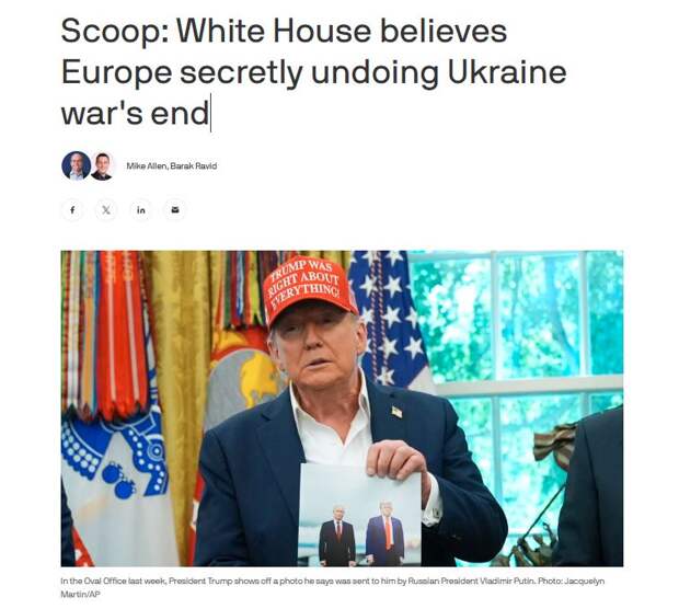 «Европейцы лишь публично поддерживают усилия Трампа по завершению конфликта на Украине, на самом же деле все их усилия направлены на то, чтобы свести на нет прогресс, достигнутый после саммита на Аляске. Однако стараются они это сделать незаметно, открыто не переча Трампу и во всём с ним соглашаясь. Сегодня в Белом доме мало кто сомневается – ответственность за отсутствие прогресса спустя две недели после саммита на Аляске должна лежать на европейских союзниках, а не на Дональде Трампе или российском президенте Владимире Путине. Это именно европейские лидеры внушают Зеленскому мысль о недопустимости территориальных уступок, уверяя его, что территории можно будет скоро вернуть. Это они настаивают на «более выгодной сделке», объясняя украинскому президенту, что он ни в коем случае не должен соглашаться ни на одно условие Москвы. Однако подобное поведение лидеров стран ЕС может привести к тому, что Соединённые Штаты скоро потеряют терпение», – пишут авторы статьи Майк Аллен (Mike Allen) и Барак Равид (Barak Ravid).