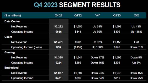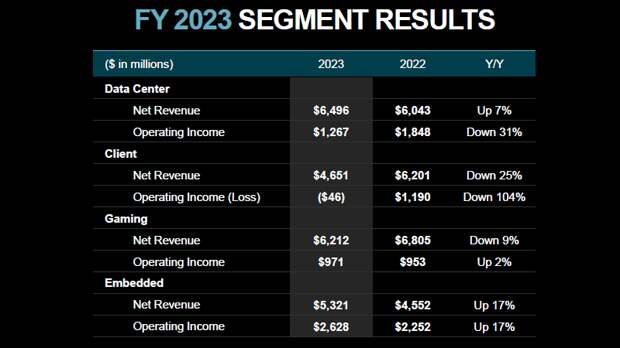 Клиентский сегмент радовал своей динамикой только по итогам четвёртого квартала, поскольку он увеличил выручку на 62 % год к году до $1,46 млрд, а также сохранил стабильность в последовательном сравнении. По итогам всего года выручка AMD в клиентском сегменте упала на 25 % до $4,65 млрд. Впрочем, на этом направлении по итогам квартала AMD удалось избавиться от убытков и завершить период с операционной прибылью в размере $55 млн, а это уже хорошо. Правда, последовательно этот показатель снизился на 61 % в силу сезонных факторов. AMD гордится тем обстоятельством, что начала поставлять на рынок клиентские процессоры с функцией ускорения искусственного интеллекта в числе первых, и сейчас её решения формируют более 90 % мирового рынка. Ноутбуки на базе процессоров поколения Strix появятся на рынке в этом году. В текущем году AMD рассчитывает увидеть незначительное увеличение ёмкости рынка ПК, с упором на второе полугодие и экспансию моделей процессоров с поддержкой ускорения ИИ. Правда, в текущем квартале выручка компании последовательно должна снизиться в соответствии с сезонными тенденциями, но в годовом сравнении она вырастет на двузначное число процентов.