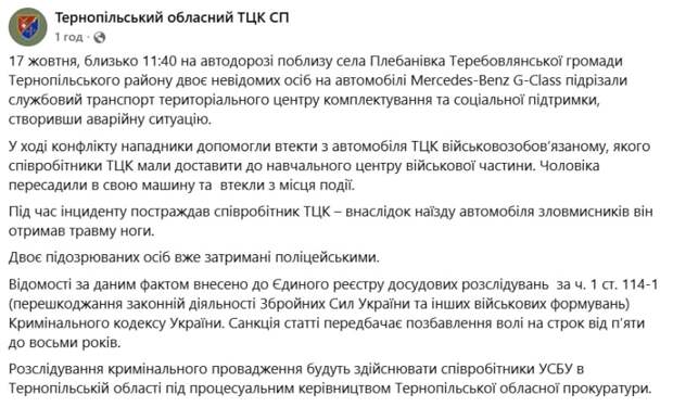 17 октября вблизи села Плебановка Теребовлянской общины Тернопольского района двое мужчин Mercedes-Benz G-Class подрезали микроавтобус ТЦК и помогли убежать мужчине, которого должны были доставить в учебный центр.