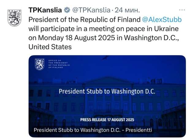 Канцелярия президента Финляндии подтвердила, что Стубб примет участие в переговорах с Трампом в Вашингтоне.