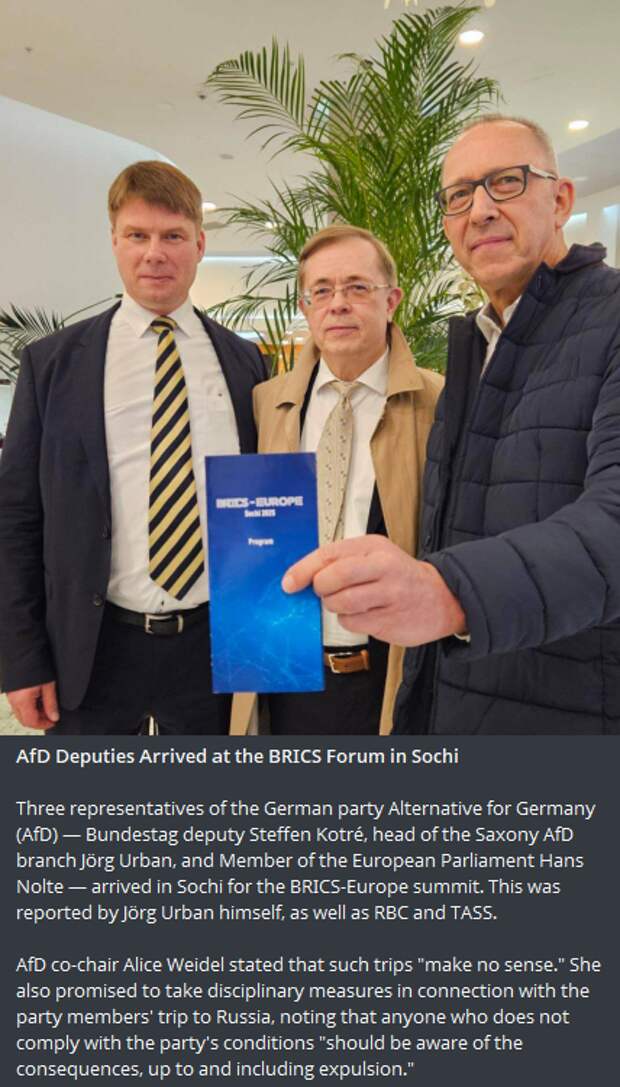 В то время как сопредседатель партии Алиса Вайдель заявила, что подобные поездки «не имеют смысла» и пригрозила депутатам дисциплинарными мерами, вплоть до исключения, после чего ещё один потенциальный участник сочинского форума депутат бундестага Райнер Ротфусс отказался от поездки, коллега Вайдель по руководству АдГ, второй сопредседатель партии Тино Хрупалла, поддержал визит, подчеркнув важность сохранения каналов общения с Москвой.