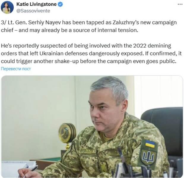 По информации Ливингстон, руководителем предвыборного штаба Залужного назначен генерал-лейтенант Сергей Наев.