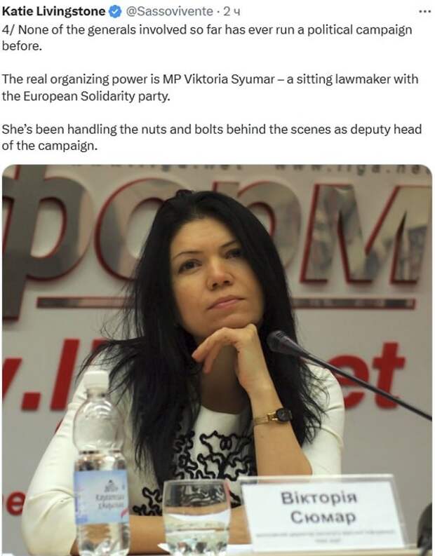Фактическим организатором политической кампании экс-главкома ВСУ, как пишет журналистка, стала народная депутат от партии Петра Порошенко «Европейская солидарность» Виктория Сюмар. Она занимается всеми деталями в качестве заместителя руководителя кампании.
