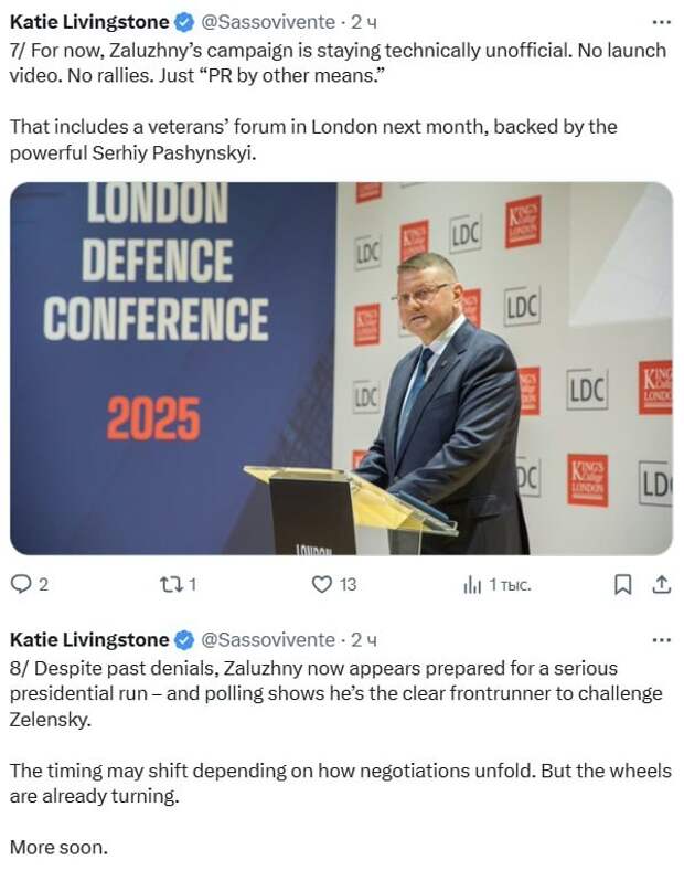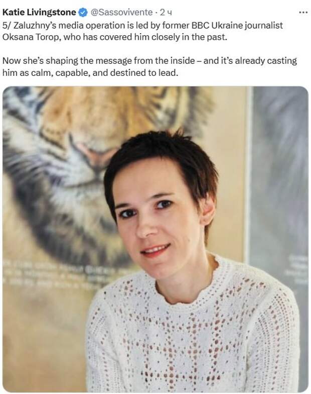 Медиаосвещение кампании, по данным Ливингстон, поручили бывшей журналистке украинской редакции ВВС Оксане Тороп, которая в прошлом активно освещала деятельность Залужного на посту главкома ВСУ.