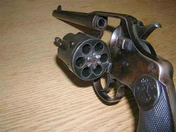 «Кольт» 1895 г. калибра .38, в котором вращение ствола осуществлялось против часовой стрелки. Длина ствола 152 мм.