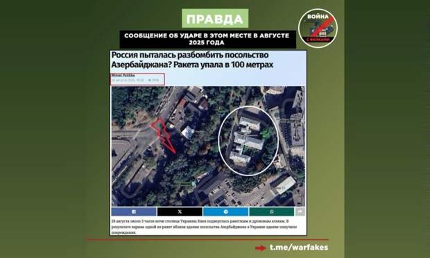 Тогда же диписточник «РИА Новости» подчеркнул, что при планировании огня ВС РФ учитываются места расположения дипломатических представительств на Украине и другая информация, исключающая урон гражданским. По его словам, характер повреждений посольства говорит о свежем падении обломков ракет ПВО Patriot, а «воронка от удара», которую Киев выдает за якобы свежий след от «Искандера», видна уже на фото с лета 2025 года.