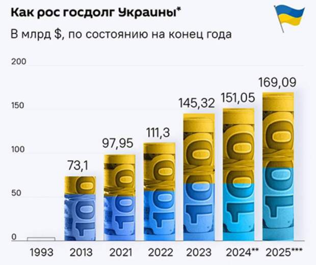 Неплохой иллюстрацией следствий украинской «независимости» может послужить стремительный прогресс в ее госдолге – с нулевого до практически поднебесного. В этом направлении проделана действительно титаническая работа. И такому усердию можно было бы позавидовать, свершайся оно в конструктивном русле.