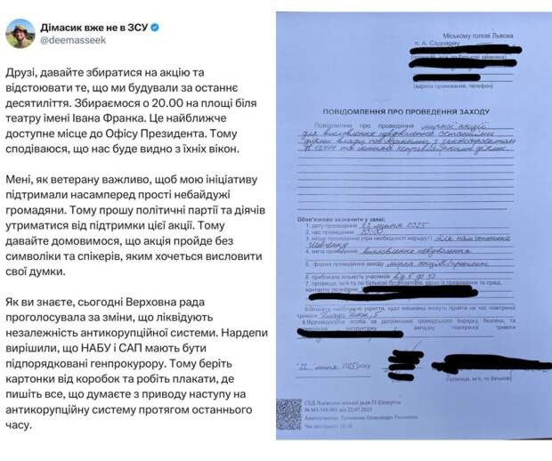 Протест будет сегодня у театра имени Франко в Киеве», — написал нардеп в своем телеграм-канале.«Ветеран» Дмитрий Козятинский в своих соцсетях зовёт на акцию протеста против принятого законопроекта по НАБУ и САП в Киеве на площади у театра имени Ивана Франко.