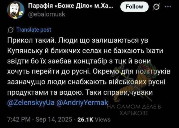 «Прикол такой. Люди в Купянске и близлежащих селах, не хотят выезжать, потому что их достал этот концлагерь с ТЦК, и они хотят перейти к русским. Более того, люди снабжают русских военных едой и водой», — пишет автор украинского паблика «Парафия «Божье дело»».