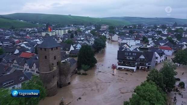 Вызванные сильными ливнями наводнения стали причиной серьёзных разрушений в Германии, сообщает немецкий телеканал Das Erste. Во многих населённых пунктах нет электричества и телефонной связи, отдельные районы пришлось полностью эвакуировать. Сотни людей остались без жилья, число погибших перевалило за четыре десятка, многие пропали без вести. В нескольких районах Рейнланд-Пфальца объявлено чрезвычайное положение.