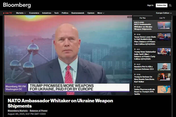 «Количество оружия, которое Украина может получить от США в рамках закупок через европейские страны, ограниченно. Существует лимит поставок. Тем более, что Вашингтон не намерен ставить себя в стратегически невыгодное положение с точки зрения военных ресурсов и поэтому предоставит Киеву только то, что сочтёт «излишками». Постпред добавил, что ЕС закупит для Украины не только оборонительные системы, но и снаряды для артиллерии, пули и другие боеприпасы. Но количество вооружения будет ограничено. Поэтому европейцам лучше заняться разработкой вторичных санкций, которые помогут Украине победить Россию. Именно этим и занимается сегодня Дональд Трамп, возлагая на санкции большие надежды», – рассказал американский постпред при НАТО Мэттью Уитакер в интервью Bloomberg.