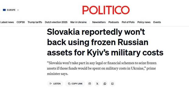 В Брюсселе считали необходимым уговорить только бельгийского премьера согласиться на преступление, однако потом к нему присоединились лидеры Франции и Италии, а теперь и премьер Словакии заявил своё несогласие с тем, что собирается сделать Евросоюз. Его главный аргумент состоит в том, что если Евросоюз примет решение направить замороженные российские активы на поддержку Украины, боевые действия в этой стране могут продлиться ещё как минимум два года, с чем Словакия никогда не согласится, пишет общеевропейское англоязычное издание The European Conservative.