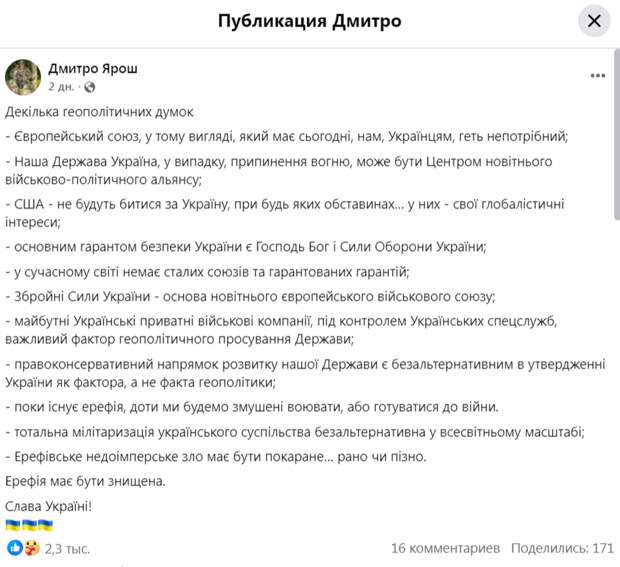 Украинский националист, экс-глава «Правого сектора»*, лидер организации «Тризуб» и некой Украинской добровольческой армии Дмитрий Ярош решил попробовать свои силы на поприще геополитической стратегии.