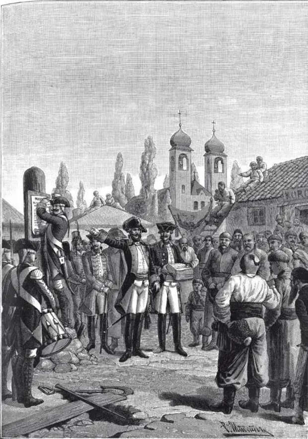 Объявление генералом Кречетниковым манифеста императрицы Екатерины II о присоединении Волыни и Подолии к России (1793 г.). Рисунок Р. Штейн, гравюра Шюблер