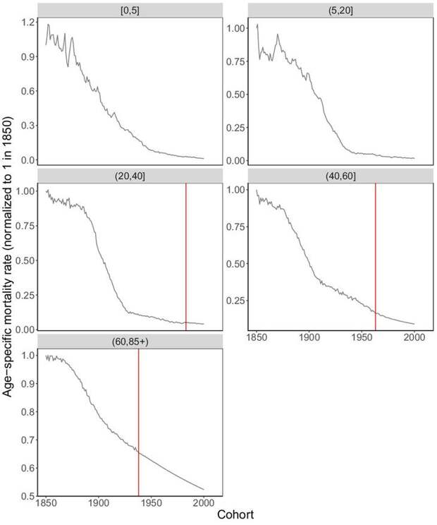 А вот после 1939 года картина резко меняется. Темпы роста продолжительности жизни упали почти вдвое. Вместо пяти-шести месяцев с каждым новым поколением мы стали получать всего два-три. И, по прогнозам авторов исследования, ни одно из поколений, родившихся вплоть до 2000 года, не достигнет заветной отметки в 100 лет в среднем.