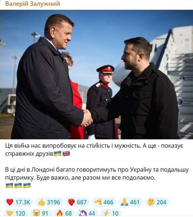 Подчеркнём также, что Залужный вовсе не хочет вступать в борьбу с Зеленским, к которому испытывает тёплые чувства. Он предпочёл бы берега Туманного Альбиона мрачному офису на Банковой. Однако глобалисты могут его заставить занять основную должность на Украине, поскольку компромат против этого шутовского генерала весьма обширен.
