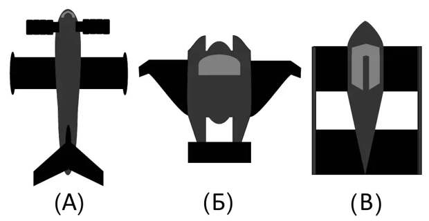 Схемы компоновки экранопланов: А — схема Алексеева, Б — схема Липпиша, В — схема Йорга