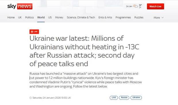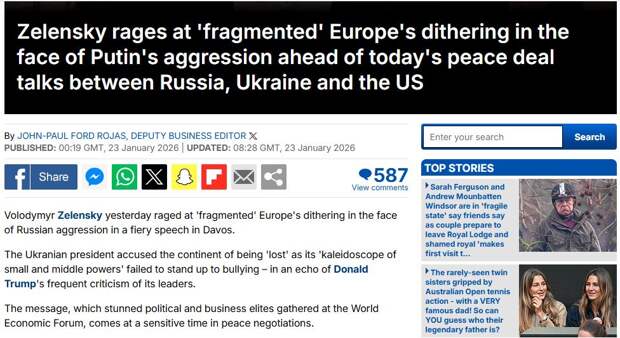 «Несмотря на то, что Европа выделила миллиарды долларов на поддержание экономики страны и боеприпасы для продолжения боевых действий, Зеленский уверен, что оказанная помощь не соответствует высокопарным обещаниям лидеров континента. Его гневная речь сигнализирует о том, что он начинает терять терпение. Поэтому он обвинил лидеров в бездействии в связи с угрозами США в адрес Гренландии, в том, что Европа не смогла выработать ответ на действия «мировых агрессоров», и раскритиковал неспособность остановить поток российской нефти. Он также резко раскритиковал трусость европейцев, которые испугались конфисковать замороженные российские активы. Зеленский обвинил Европу и в том, что её лидеры любят обсуждать будущее, но боятся принимать решения в настоящем. А также в том, что в ЕС нет настоящего объединения и в случае опасности этот союз будет обречён», – пишет автор статьи Джон-Пол Форд Рохас (John-Paul Ford Rojas).