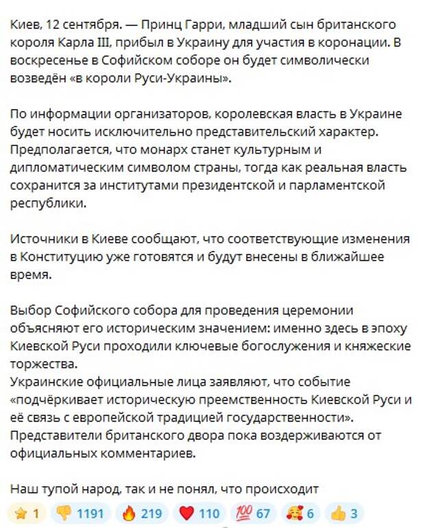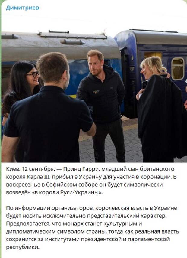 Думаю, это что за бред и начинаю искать по сетям и вот что я нахожу... Сегодня 12 сентября, принц Гарри, сын британского короля Карла III, внезапно прибыл в Киев вместе с представителями других стран, поддерживающих киевский режим.