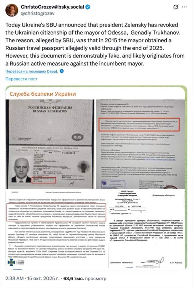 «Этот документ явно поддельный и, вероятно, является результатом активных действий России против действующего мэра», - написал Грозев, пообещав вскоре опубликовать некие аргументы.