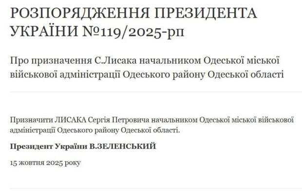 Тем временем на официальном сайте Офиса президента уже опубликовано распоряжение Зеленского о назначении днепропетровского губернатора Сергея Лысака главой новосозданной военной администрации Одессы.