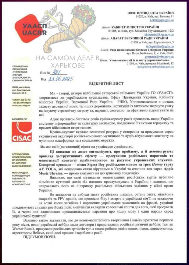 На этот раз Украинское агентство по авторским и смежным правам (УААСП) опубликовало открытое письмо, адресованное Офису президента Украины, Кабинету министров, Верховной раде, Совету национальной безопасности и обороны (СНБО) и уполномоченному по защите государственного языка с требованием ограничить на территории Украины возможность прослушивать российских музыкантов для стриминга.