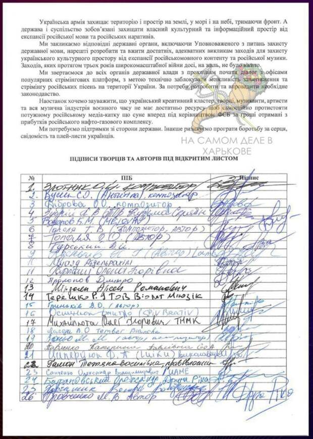 Обращение подписали 130 деятелей культуры, в том числе участники ТНМК, «Другой Реки», Melovin, Александр Злотник, Тарас и Елена Тополя, Ольга Диброва, Арсен Мирзоян, Олег Михайлюта, Александр Сидоренко и другие представители украинского музыкального сообщества.