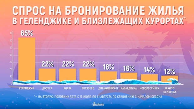 Сейчас Геленджик занимает 9-е место в списке самых востребованных направлений для отдыха. До этого он был на 16-м месте.В настоящее время город входит в тройку лидеров среди популярных морских курортов по количеству бронирований, обогнав Крым. Однако во главе рейтинга все также находятся Сочи и «Сириус». Спросом стали пользоваться и курорты, находящиеся недалеко от Геленджика: Дивноморское (на 18%), Кабардинка (на 16%), Новороссийск (на 14%), Архипо-Осиповка (на 12%).
