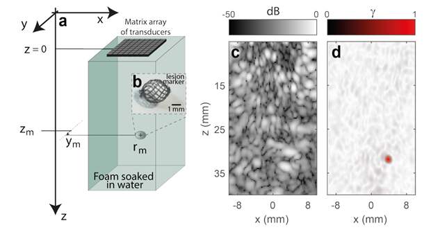 Ученые поместили маркер в пену, которая создает ультразвуковую картину, похожую на ткани человека. На обычном УЗИ-снимке маркер не был виден в зернистой структуре. Но метод «матрицы-отпечатка», для которого создали цифровую модель маркера, показал его точное место.