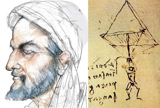 Аббас ибн Фирнас, изобретатель древнейшего известного парашюта; справа – рисунок парашюта из рукописи Леонардо да Винчи