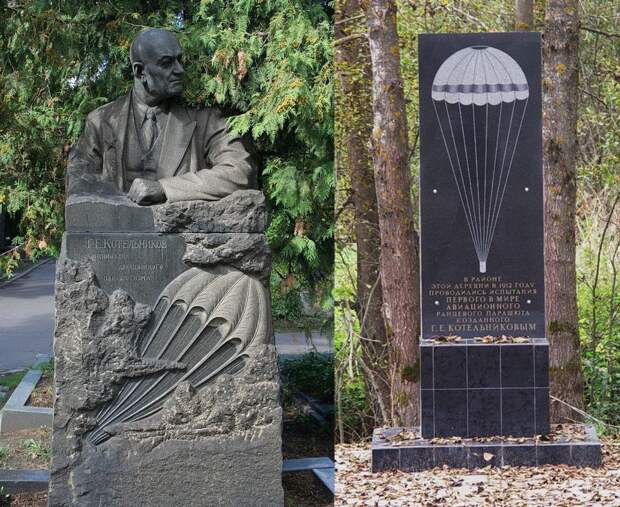 Могила Г.Е. Котельникова на Новодевичьем кладбище г. Москвы – место паломничества парашютистов; справа – памятный знак на месте успешных испытаний первого в мире ранцевого парашюта РК-1 в деревне Салюзи (ныне Котельниково) под Санкт-Петербургом
