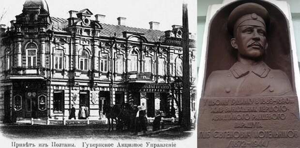Новое (с 1900 года) здание Полтавского губернского акцизного управления, где работал Г.Е. Котельников, и бюст изобретателя первого в мире парашюта современной конструкции в нише на стене этого здания (современный вид)